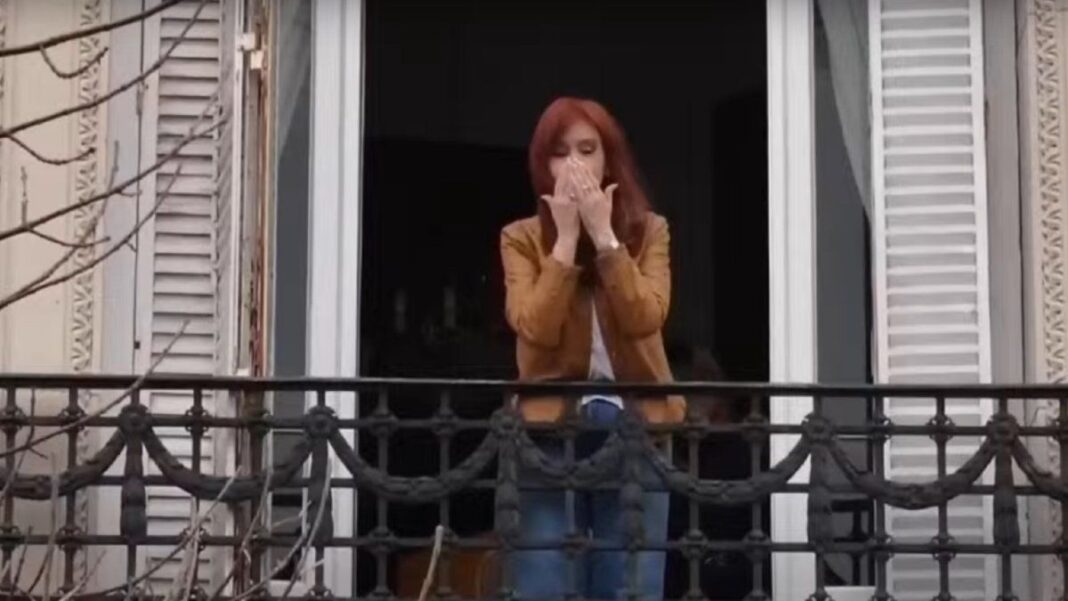 Cerca de las 15:30, Cristina apareció por primera vez en el balcón de su domicilio, vestida con una campera caqui, remera blanca y una escarapela, saludó a la multitud que fue a apoyarla.