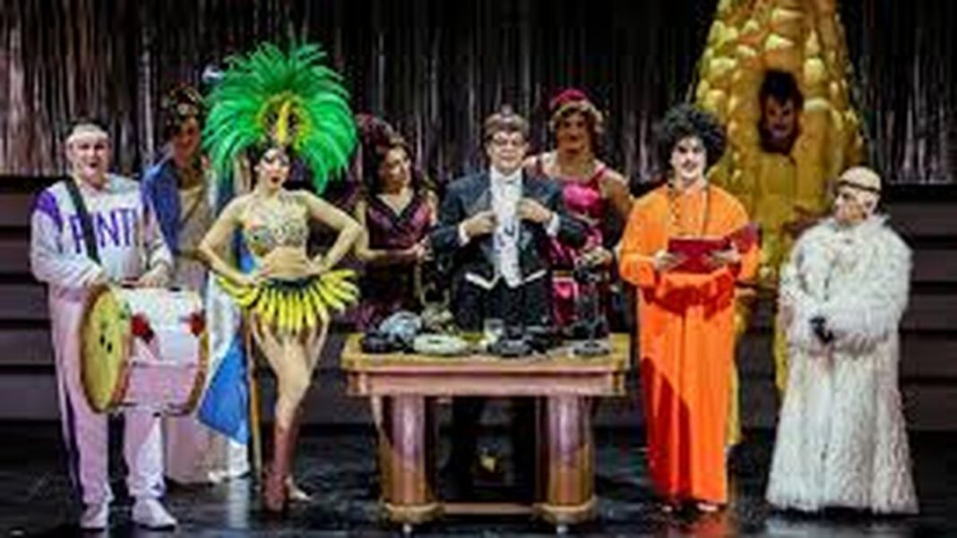 La obra parte de la idea del inmenso Gonzalo Demaría, actual director del Cervantes y prolífico dramaturgo, escritor e investigador, especialista en amalgamar palabras y pintar aldeas en las que resulta un deleite perderse. En el 2011 Demaría publicó el libro “La revista porteña: teatro efímero entre dos revoluciones (1890-1930)” y pasaron casi 15 años para que pudiera plasmar aquellas reflexiones en una obra teatral. Autor de las magníficas “Sansón de las Islas” (que se vio en el San Martín este año); “La comedia es peligrosa” escrita en ocasión de los 100 años del Cervantes; “Happyland”, “El romance del Baco y la Vaca”, escrita para Marco Antonio Caponi, con quien hoy vuelve a compartir este proyecto y “Tarascones”, que continúa multiplicando temporadas, con “La revista del Cervantes” Demaría acercó la idea y resulta imposible no pensar en su pluma cuando discurren textos en verso, siempre ocurrentes, bellos, rítmicos e hilarantes.